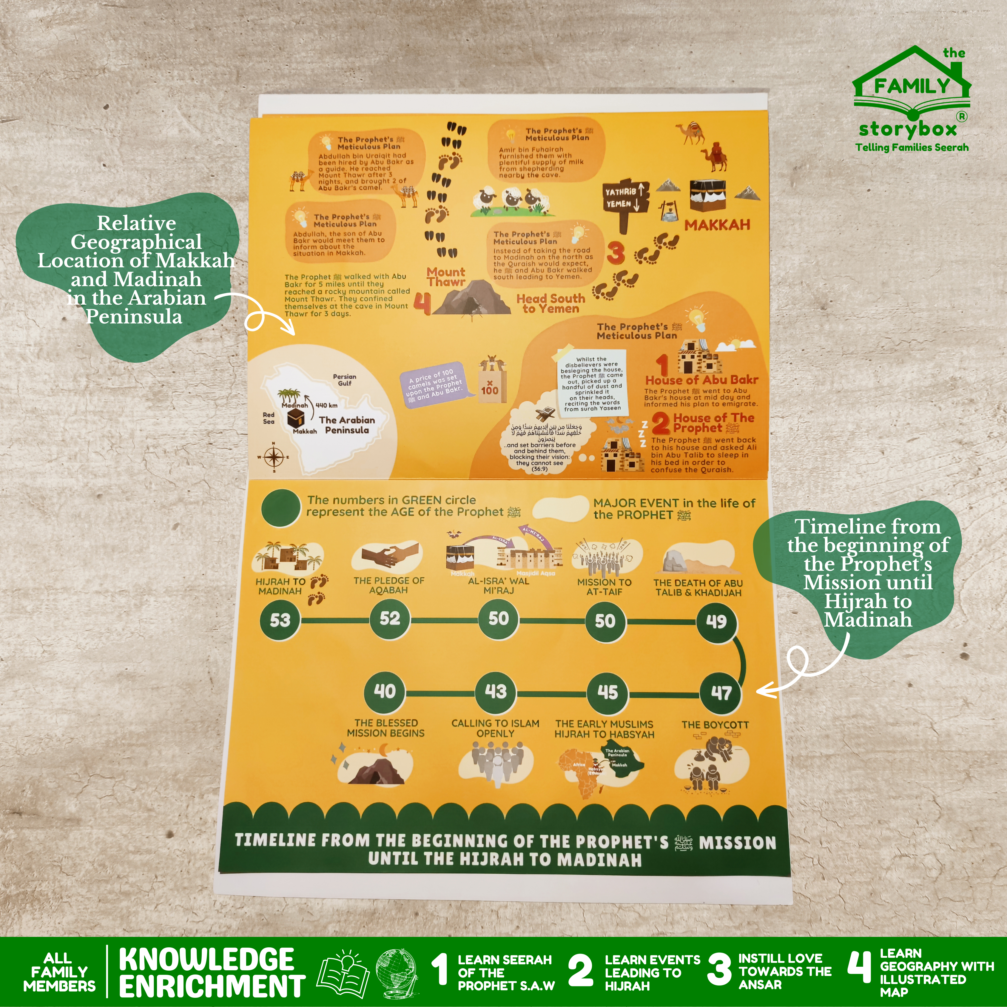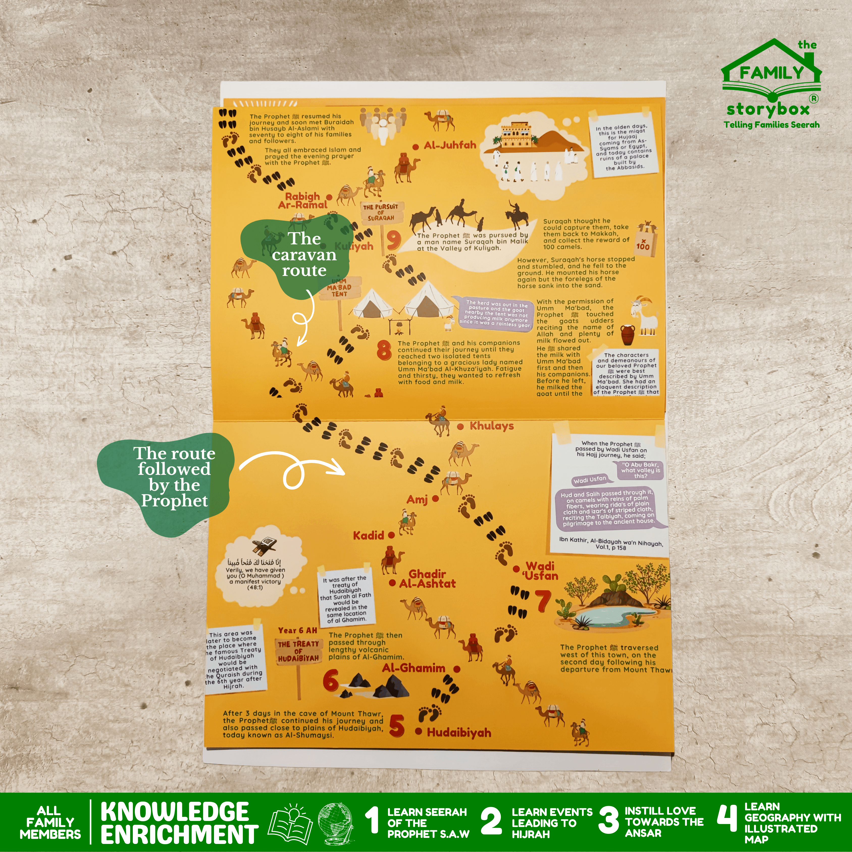 A tall folding map is included to illustrate the journey of the Prophet ﷺ from the city where he was born, Makkah, to Al-Madinah on the north. The map also includes significant landmarks and events during the Hijrah journey, including the events at Ummu Ma’abad tent and the pursuit of Suraqah.