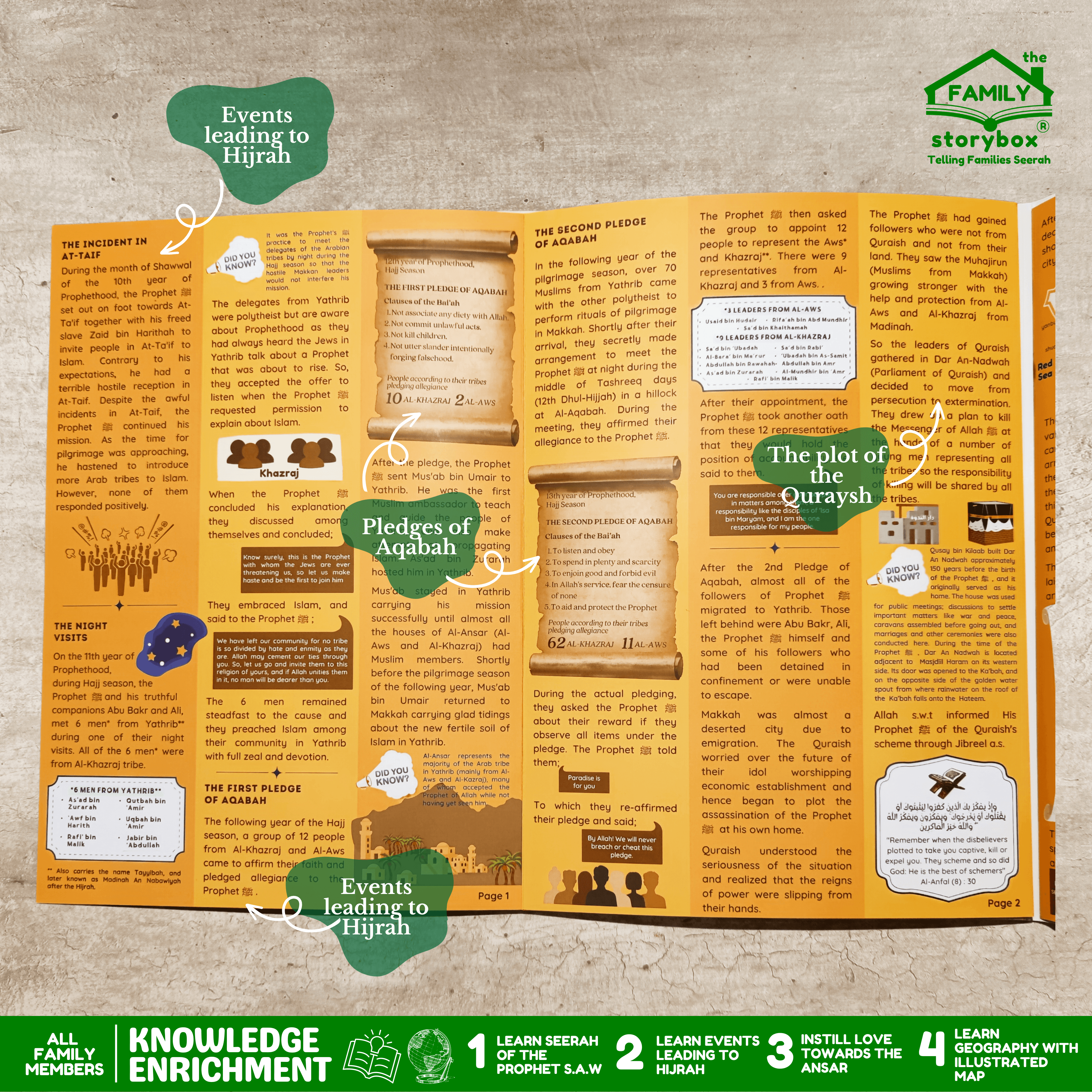 This Folding Storymap is an exciting new way to learn about the events leading to Hijrah (migration) of our beloved Prophet Muhammad ﷺ from his birth land in Makkah, to Yathrib (later known as Al-Madinah An-Nabawiyah).