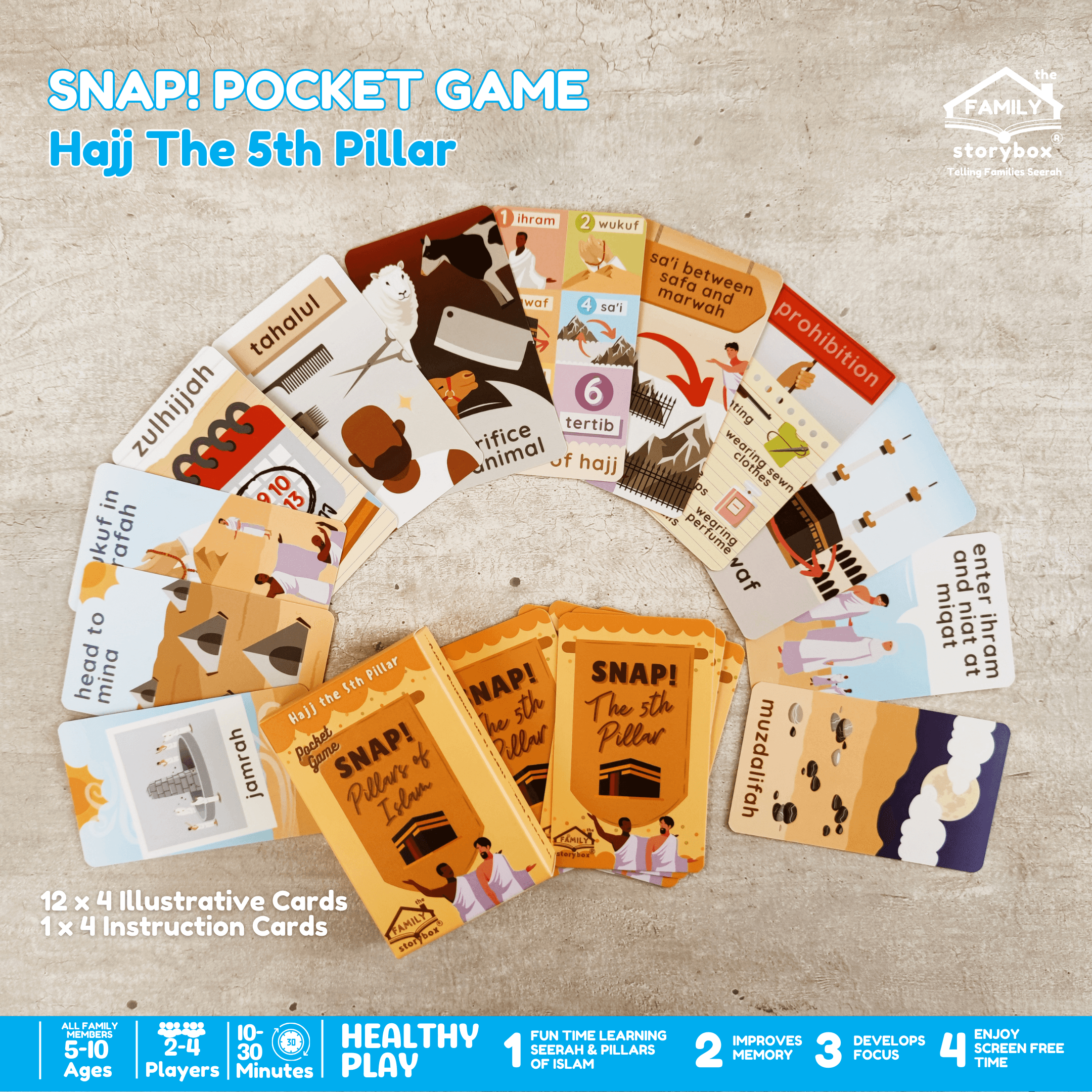 The objective of this SNAP! Pocket Card Game is to get the highest of pillars and obligatories of Hajj. These well crafted card game can be played in many ways too. From finding the right combination as SNAP! to improvising them to become memory for all ages, that means the elderly too! Get the most points and win the game!